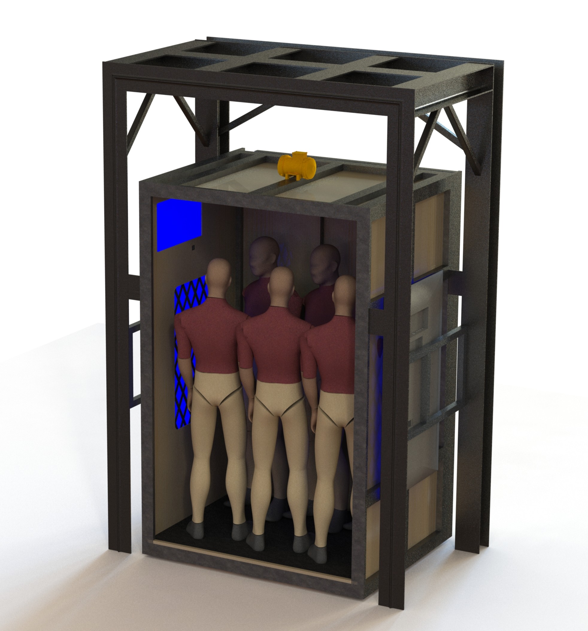 Un client du secteur des expériences immersives souhaitait créer un ascenseur immersif pour un escape game, donnant aux utilisateurs l’impression de monter et descendre plusieurs niveaux. Le projet combinait des mouvements subtils, des portes automatiques, des vibrations, de la soufflerie et des écrans haute définition diffusant des vidéos simulant les décors en mouvement.