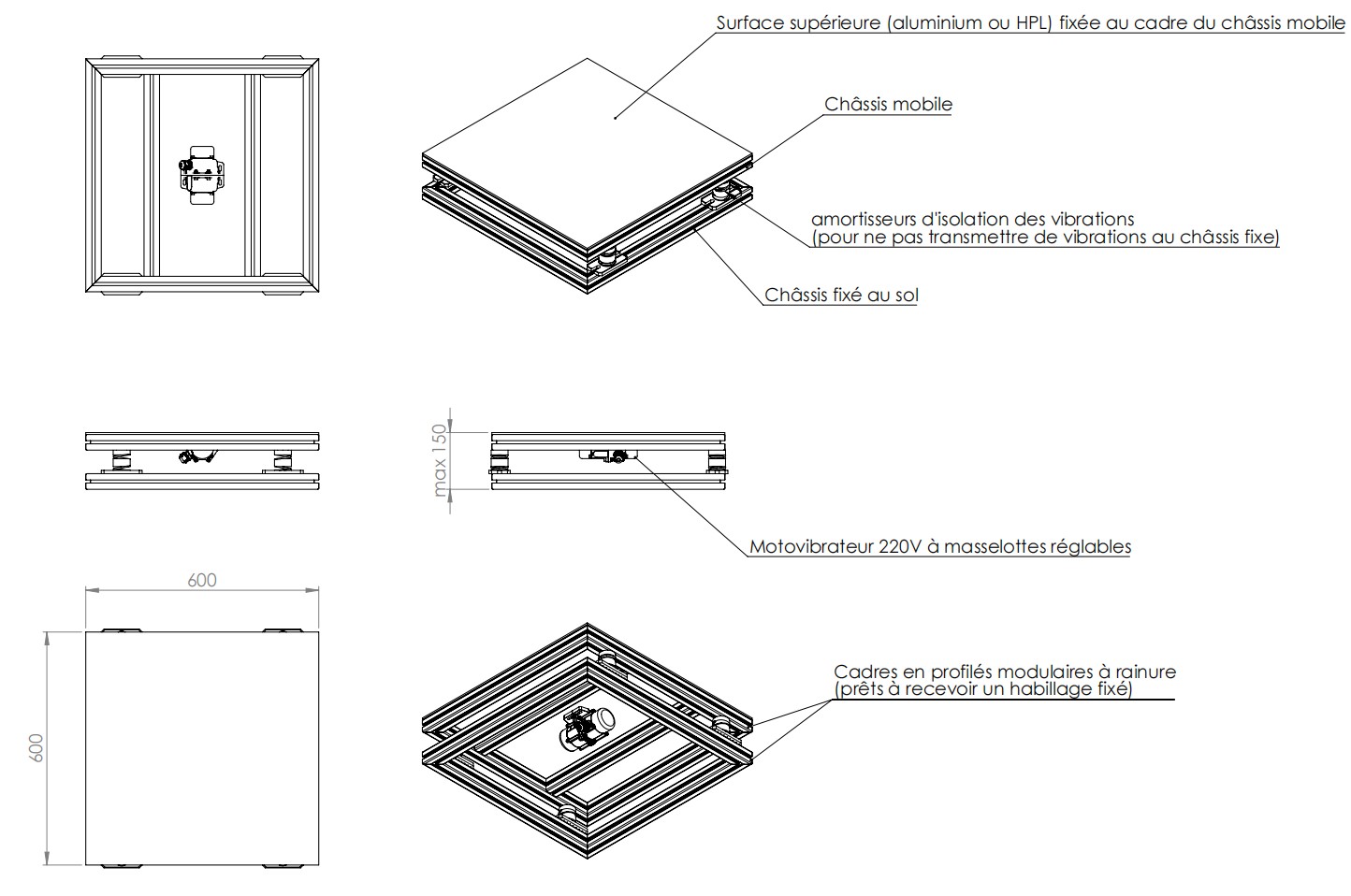 • Conception d’un châssis en profilés modulaires pour faciliter le montage et l’intégration des décors et équipements divers